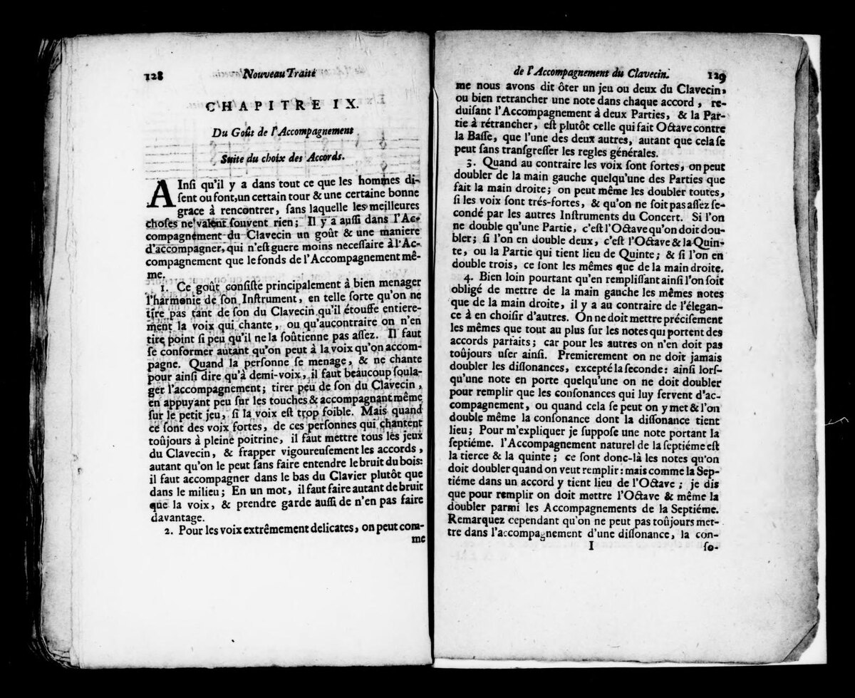 Согласно Сен-Ламберу (1710), инструмент не должен заглушать голос, но обязан давать ему опору. Адаптируйтесь к певцу. Если голос тих — играйте мягко, сокращая аккорды. Для мощных голосов удваивайте партии левой рукой и используйте полные регистры. Громкость должна соответствовать солисту. Для объема звука применяйте арпеджирование (разложение аккордов). Это идеально для речитативов. В быстрых ариях аккорды берут одновременно с басом. Иногда в речитативе уместны долгие паузы, редкие «случайные» ноты или даже эффект «мушкетной стрельбы» (быстрый треск) с резкой остановкой на консонансе. Суть мастерства — передавать дух слов: не спешить в сценах грусти и быть яростным в гневе. На органе техника иная: нужно строгое легато без арпеджио и повторов, так как инструмент сам держит звук, не требуя клавесинных ухищрений.