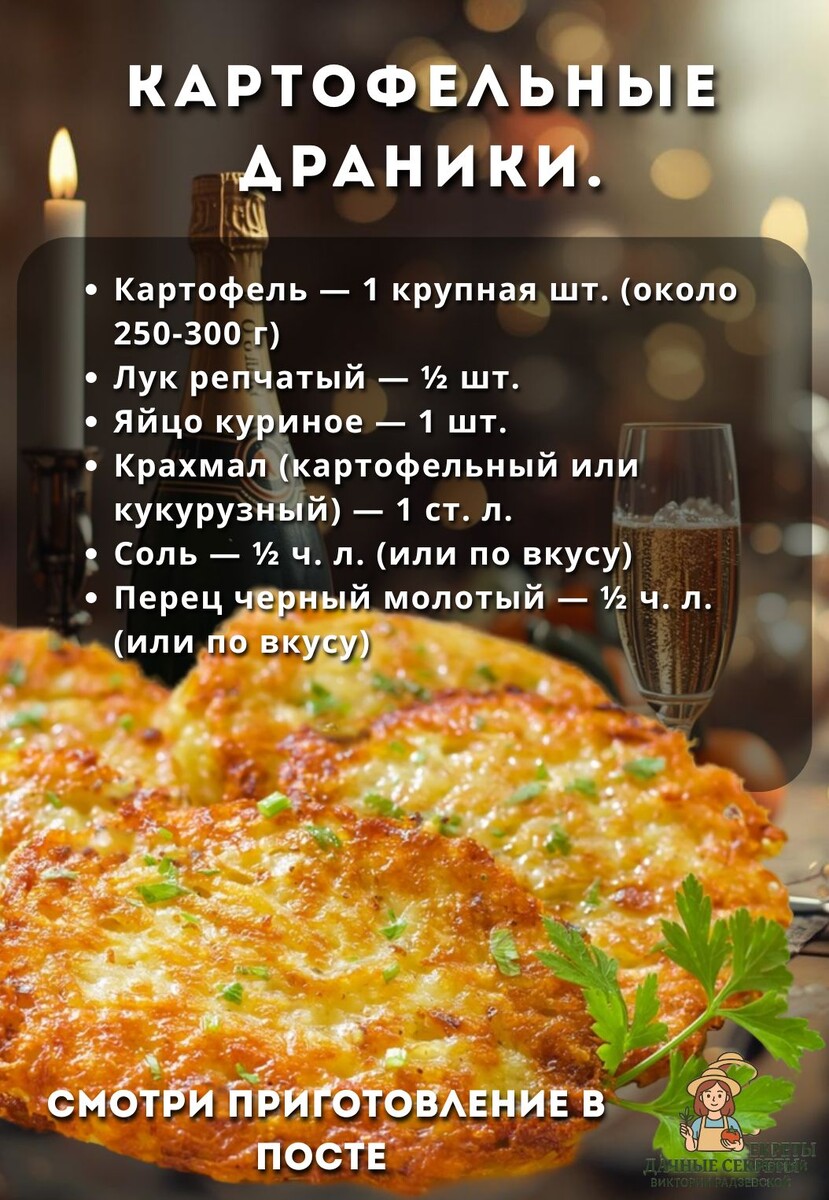 1 большую картошку натираем на терке. Половину лука натираем также на терке. Отжимаем сок. В миску перекладываем картошку с луком и добавляем 0,5 ч. л. соли и 0,5 ч. л. черного перца. . 1 ст. л. крахмала и 1 яйца. Перемешиваем и формируем руками драники. Жарим на сковороде до золотистого цвета. Подаем со сметаной. Ещё больше на моих аккаунтах в Телеграмм. Читайте также: