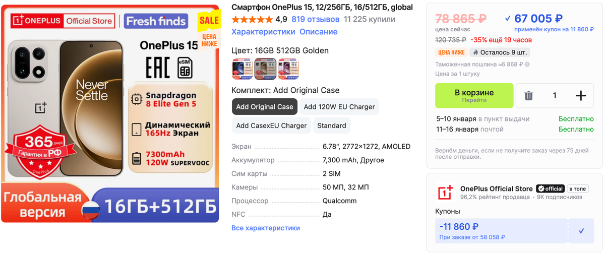 В этом году OnePlus удивил как фанатов, так и простых зрителей. Компания нарочно отказалась от истинного флагмана, заметно ослабив позиции номерного смартфона. Вместо условного «топа за свои деньги» получился игрофон для ценителей. Стоило ли оно того, будем разбираться в цикле материалов про OnePlus 15. Сегодня расскажу о первых впечатлениях. Приятного чтения! У себя на Родине 15-й OnePlus стартовал в конце октября, а в глобальном исполнении он появился всего спустя пару недель. Новинка сразу же появилась на маркетплейсах, где были достигнуты какие-то бешеные цифры продаж. Например, на одной только страничке Алиэкспресс за чуть больше месяца купили около 11 тысяч трубок. Фантастика. Стоит ли гнаться за более дешевой китайкой? История спорная, но не лишена смысла, поскольку ее плюс в нормальной комплектации, цене и наличии звонилки с записью разговоров. В остальном есть нюансы с прошивкой и обновлениями, гарантией и наличием eSIM. Я взял глобалку в черном цвете на 12/256 ГБ. Покупал на