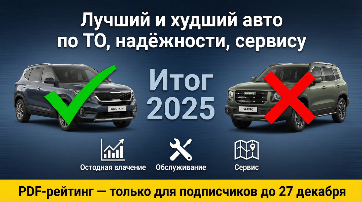 — Изучил 1 400 комментариев от вас — реальных владельцев. Из всего этого я собрал единственный в Рунете рейтинг, в котором нет рекламы, нет “партнёрских моделей”, а есть только цифры, чеки и личный опыт. → Kia Seltos