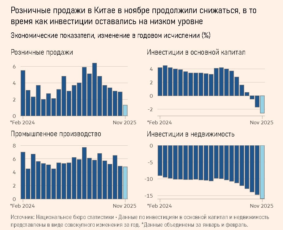 Проблема в долгах. Ноябрьские данные окончательно подтвердили: китайская экономика теряет импульс. Промышленное производство растёт слабее ожиданий, розничные продажи почти стоят, инвестиции, прежде всего в недвижимость, продолжают проседать. Это уже не статистический шум, а устойчивая тенденция. Ключевая проблема кроется во внутреннем спросе: на него Китай делает большую ставку, пытаясь переформатировать экономику с экспорта на внутренний рынок. Но китайский потребитель экономит, бизнес откладывает инвестиции, а стимулы государства всё хуже доходят до реальной экономики. Потеря уверенности становится системной. Рынок жилья остаётся главным каналом распространения кризиса. Продажи падают, девелоперы висят на долгах, а домохозяйства чувствуют себя беднее: их главный актив перестал расти в цене. Для Китая это удар по самой основе модели благосостояния. Не помогают, а, скорее, мешают и постоянные помпезные "мегастройки", в которых часто смысла мало, а понтов через край. Очередные, как