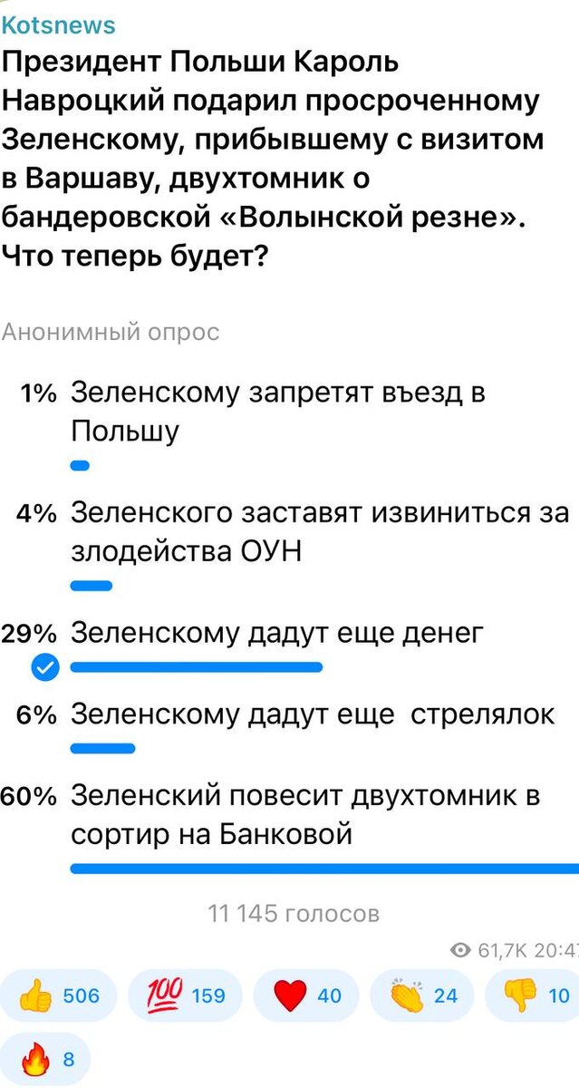 ⚡️⚡️⚡️ 60 процентов подписчиков уверены - Зеленский подотрется этим двухтомником. Ему пофиг, лишь бы деньги давали.