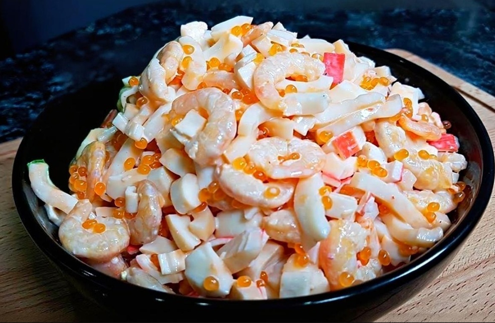 Уважаемые читатели, обратите внимание: если морепродукты или рыба являются нежелательными продуктами для вас или ваших гостей, попробуйте адаптированный вариант салата.