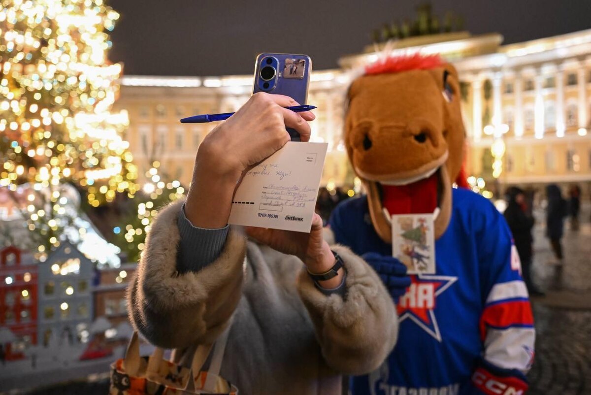Появление на Дворцовой площади талисмана хоккейного клуба СКА наделало немало шума. Конь-Огонь – такое имя он носит – тут же затмил прогуливающихся здесь Дед Морозов и Снегурочек, не говоря уже о продавцах, торгующих символами года и светящимися шариками. Талисману СКА долго не удавалось пробиться к «Новогодней почте» «Петербургского дневника» – столько желающих было сфотографироваться с ним, взять автограф, а то и просто постоять рядом и поближе рассмотреть все детали формы, выполненной в сине-бело-красных цветах – в полном соответствии с российским флагом. А вот голова с ярко-красной гривой напоминала еще и о том, что наступающий 2026 год – год Огненной Лошади. Сам Конь-Огонь рассказал, что участвует в «Новогодней почте» уже второй раз и сейчас будет отправлять открытку друзьям в Улан-Удэ. В прошлом году он приходил сюда вместе со своими товарищами-хоккеистами. А сейчас они делегировали ему все полномочия и попросили поздравить от их имени петербуржцев, гостей города и особенно болел