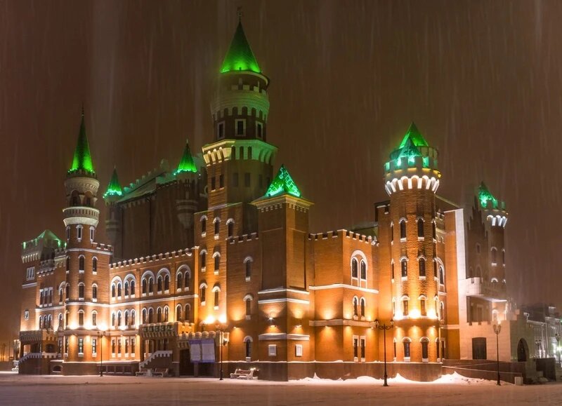 Царевококшайский кремль в Йошкар-Оле представляет собой удивительное собрание истории, архитектуры и культуры. В зимний период этот замок, словно большой сладкий пряник, покрывает снег, создавая волшебство в каждой детали его оформления. Главная крытая площадка с красивым собором и красными кирпичными стенами делает это место настоящим магнитом для туристов и местных жителей.