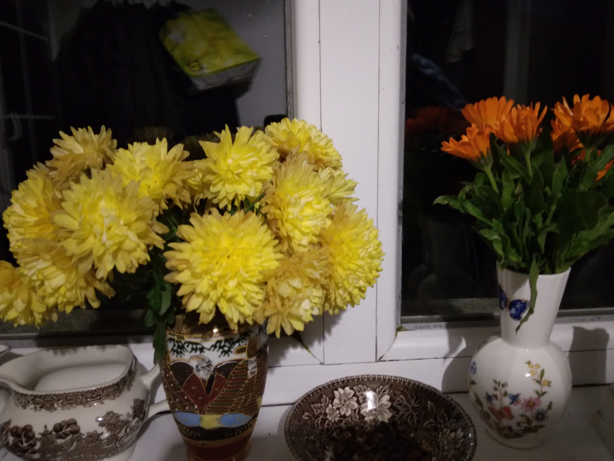 Однако даже по ночам температуры всё ещё плюсовые, минус ночью обещают только с конца будущей недели, так что ещё кое- где держатся хризантемы и ноготки. Мне даже по случаю достался букет жёлтых хризантем. Половину цветов я отдала Марине Георгиевне и она написала с ними этюд.