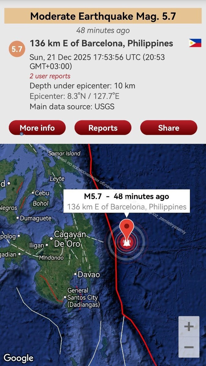 Согласно сегодняшнему предупреждению на южных Филиппинах произошло умеренное землетрясение М5