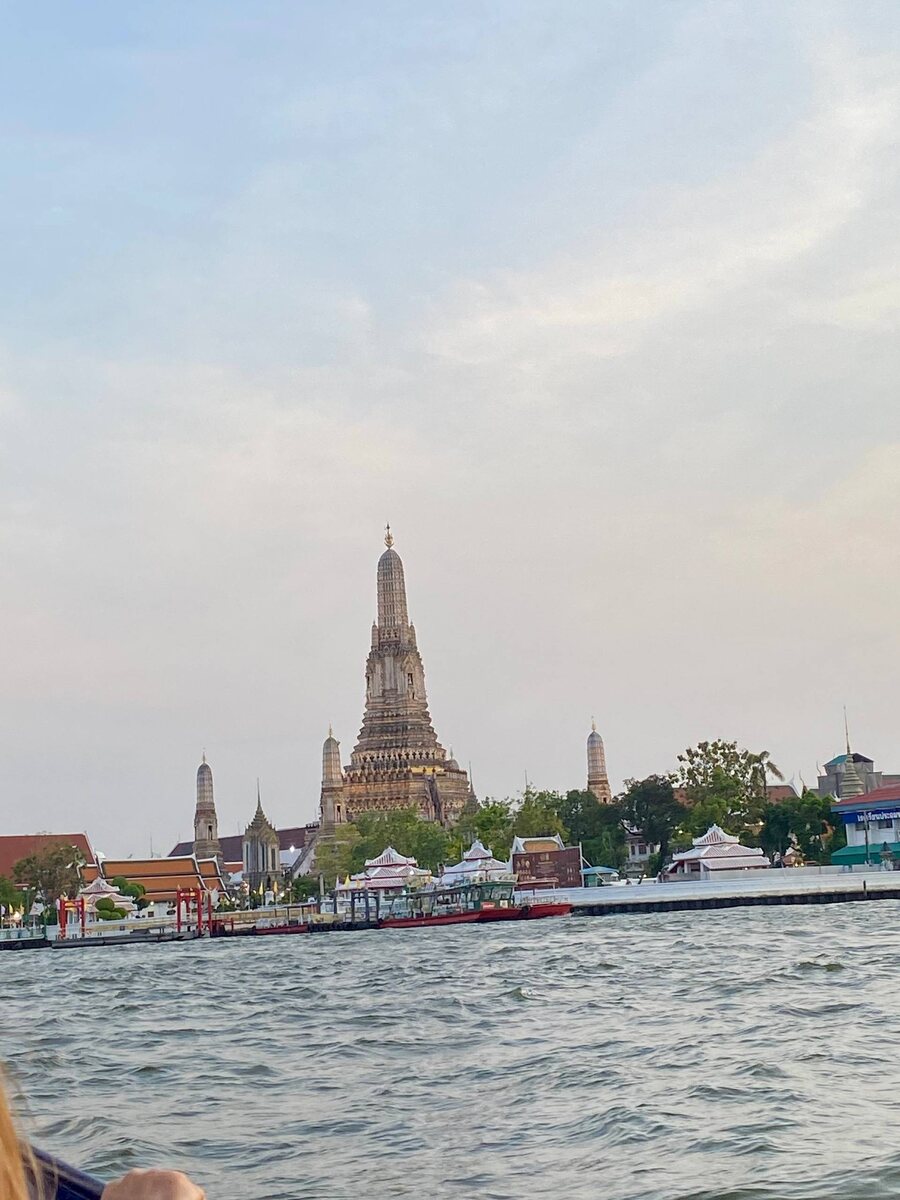 Храм Утренней зари Самый высокий храм Бангкока Его смогли посмотреть только в ходе вечерней прогулки по реке. Удалось увидеть его и при свете, и после заката со включенной подсветкой. Начало его истории туманно, но он уже существовал на этом месте в 17 веке, какое то время здесь хранился Изумрудный Будда- главная святыня королевства, потом он был в запустении, в 19 веке увеличили высоту главной пагоды, а с 2013 здесь велись реставрационные работы. Основной изюминкой храма является его отделка фарфоровыми плитками. Это только издалека он кажется серым. Центральный пранг/башня и четыре боковые башни инкрустированы цветным фарфором, а также увенчаны семиконечным трезубцем, считающимся трезубцем Шивы. Фарфор был очень дорогим в те времена и по легенде китайские суда использовали тюки с битым фарфором в качестве балласта, а тайцы за бесценок скупали его, а затем цветными кусочками украшали этот храм. Храм является действующим, а в ноябре особые монахи получают одежду из рук самого короля. #