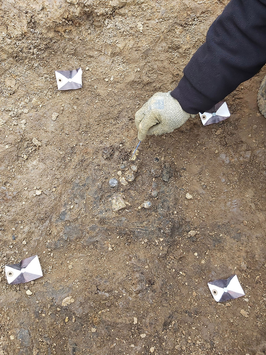У ног покойной находились два сосуда франкского происхождения с сохранившимися органическими остатками, что является редчайшим случаем для этого времени. Их анализ может пролить свет на погребальные ритуалы переходного периода между язычеством и ранним христианством. Ещё одна находка поначалу оставалась в блоке земли, извлечённом для лабораторных раскопок. Рентген показал очертания большого серебряного креста, лежавшего лицевой стороной вниз на деревянной основе.