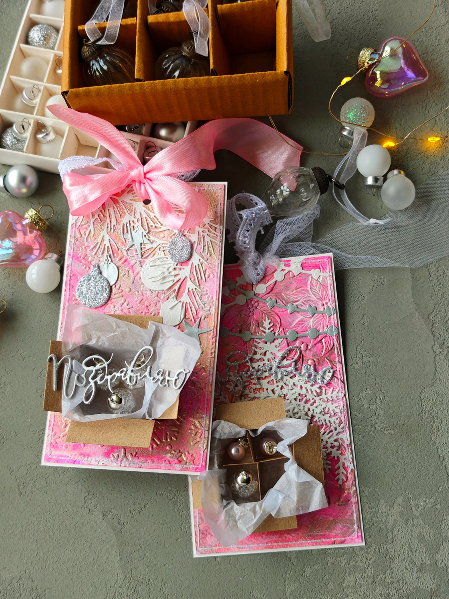 Привет! С вами Надя )) Время наряжать елку, достать заветные коробки с сокровищами, распаковывать, разворачивать бумагу и извлекать на свет ценные стеклянные игрушки вместе с воспоминаниями )) "В спичечном коробке" волшебным двойным прокатом превращается в квадратную коробку , добавляю в нее разделитель, тишью и те самые елочные шары. Из веточки набора "Хвойный лес" и шаров "Автомобиль с подарками" соберем елку, добавим звезд "Русские сезоны". На вторую открытку вешаю "Бусы повесили", пихту собираю из "Под елочкой скакал" и "Сосновый бор", добавляю надпись из "Мои поздравления".