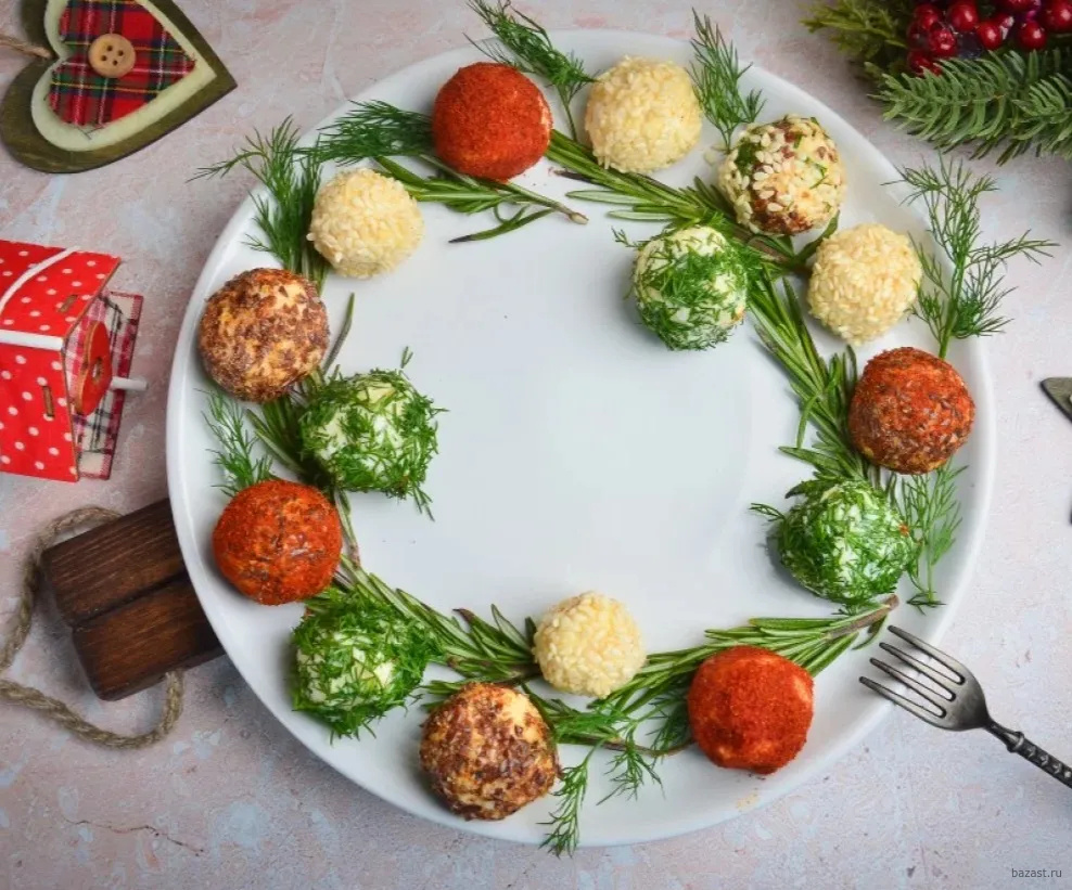 Оригинальная закуска в виде рождественского венка — это не только вкусно, но и красиво. Приготовление такой закуски не займет много времени и не потребует особых кулинарных навыков. Для создания основы венка можно использовать веточки розмарина, которые придадут блюду аромат и привлекательный внешний вид. Если розмарина нет под рукой, его можно заменить петрушкой, укропом или другой подходящей зеленью. Процесс приготовления прост: зелень аккуратно выкладывается на блюдо в форме венка, создавая основу для закуски. Затем на эту основу можно выложить различные ингредиенты: оливки, маслины, кусочки сыра, ветчины, сухофрукты и орехи. Все зависит от вашей фантазии и предпочтений. Такая закуска станет отличным украшением праздничного стола и порадует гостей своей оригинальностью и вкусом. ИНГРЕДИЕНТЫ НА 3 ПОРЦИИ Сыр твердый 80 г Яйцо куриное 2 шт. Соль по вкусу Чеснок 1 зубчик(а) Майонез 1.5 ст.л. Розмарин 10 веточка(и) Кунжут 2 ст.л. Паприка сладкая молотая 2 стакан(а) Сметана 30% 2 ст.л. С