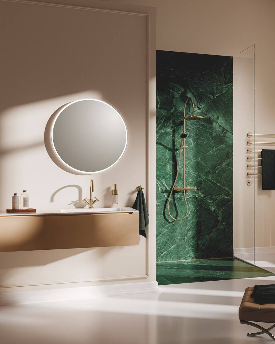 Одна отделка. Один язык дизайна. Бесконечная гармония. От раковины до душа — каждый элемент говорит на одном визуальном языке. Отделка Brushed Champagne (22-каратное золото) придает мягкое, сияющее свечение, а глубокий зеленый мрамор добавляет глубины и характера. Сочетание, которое кажется одновременно праздничным и вневременным. Культовый дизайн Tara прослеживается по всей комнате: крестообразные ручки, скульптурные контуры, идеально выровненные аксессуары и круглый полотенцесушитель, повторяющий ту же геометрию. Хотите узнать подробнее? ▫️Звоните нам📲 +7(495)120-67-77 #dornbracht #сантехника #bathroom #designbathroom