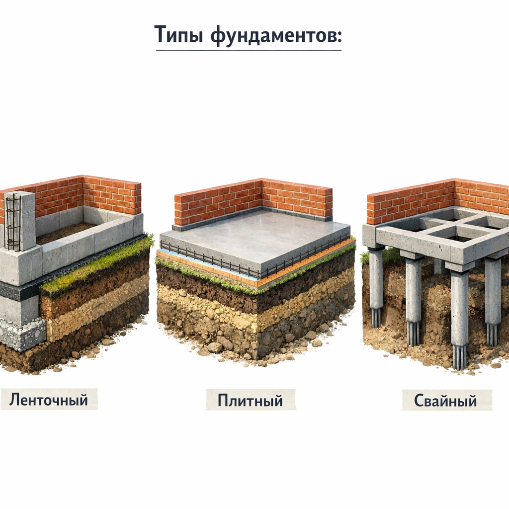 Я за свою практику видел десятки трещин, перекосов и вечных сыростей — и почти всегда причина одна: выбрали основание “по привычке”, а не по условиям участка. Если Вы сейчас на этапе выбора, запомните простую мысль: дом редко ломается сверху. Дом ломается снизу. Поэтому разберём три самых популярных решения — лента, плита, сваи — без рекламных сказок и “у соседа так”. Перед тем как спорить “лента или плита”, посмотрите на три вещи: 1) Грунт. Песок, суглинок, глина, насыпной слой — это разные миры.