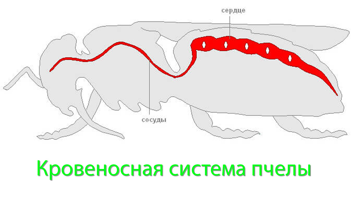 Это текстовой вариант аудиоответа Владимира Георгиевича. Кровеносная система у пчелы, у матки, у трутня — незамкнутая. В спинной части имеется пятикамерное сердце, вот оно расположено. Одна камера, вторая, третья, и так далее. Вот видны пять камер. Потом они переходят в аорту. Аорта проходит здесь и в голове заканчивается открытым концом. Ни клапана, ничего нет. И вот эти камеры качают кровь из одной камеры в следующую. И все пять камер работают, качают и качают эту кровь. Кровь у пчёл, в отличие от высших животных, называется гемолимфой, потому что у них и кровь, и лимфа смешаны. У них нет отдельного лимфообращения, как у нас. У высших животных кровь разносит кислород по организму. У пчёл кислород кровь не разносит. Она разносит только питательные вещества. Ну, в какой-то степени немного кислорода — тоже самое. Но в основном — только питательные вещества. Вот сердце работает, качает и качает. В голове кровь вытекает, омывает все