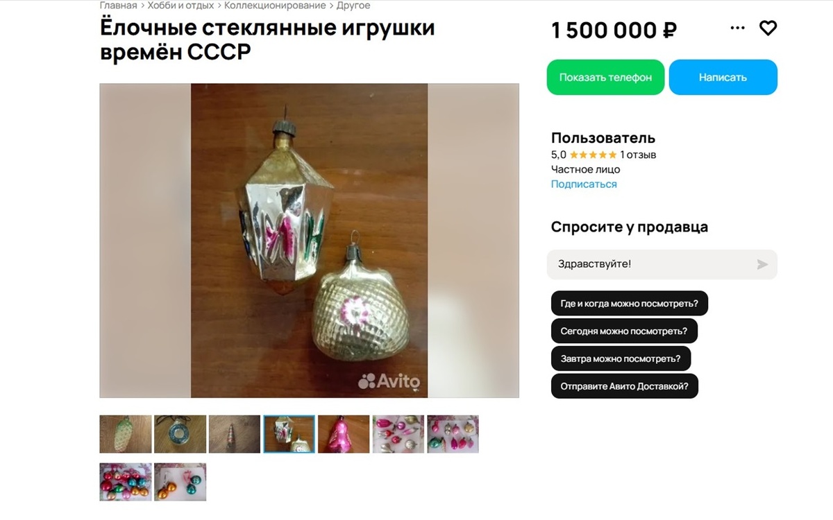 В Воронеже появилось необычное объявление о продаже коллекции советских елочных игрушек. Владелец оценивает раритетные украшения 1960‑х годов в внушительную сумму – 1,5 млн рублей. Соответствующее объявление появилось на сайте «Авито». Пользователь продает две стеклянные шишки (по словам продавца, куплены в начале 1960‑х годов, состояние — не идеальное), а также стеклянную пирамидку, которую оценил в 200 тысяч рублей. В тексте объявления продавец четко обозначил свою позицию: «Прошу свои мысли и комментарии мне не писать. Мне они не интересны. Свой товар не предлагать». Пока желающих купить столь дорогое украшение не нашлось. Ранее на том же сайте бесплатных объявлений в Воронеже просили за елочную игрушку 450 тысяч рублей. По словам продавца, она эксклюзивная. Покупатель заберет одну круглую игрушку, в середине которой выбита звезда и число «50».