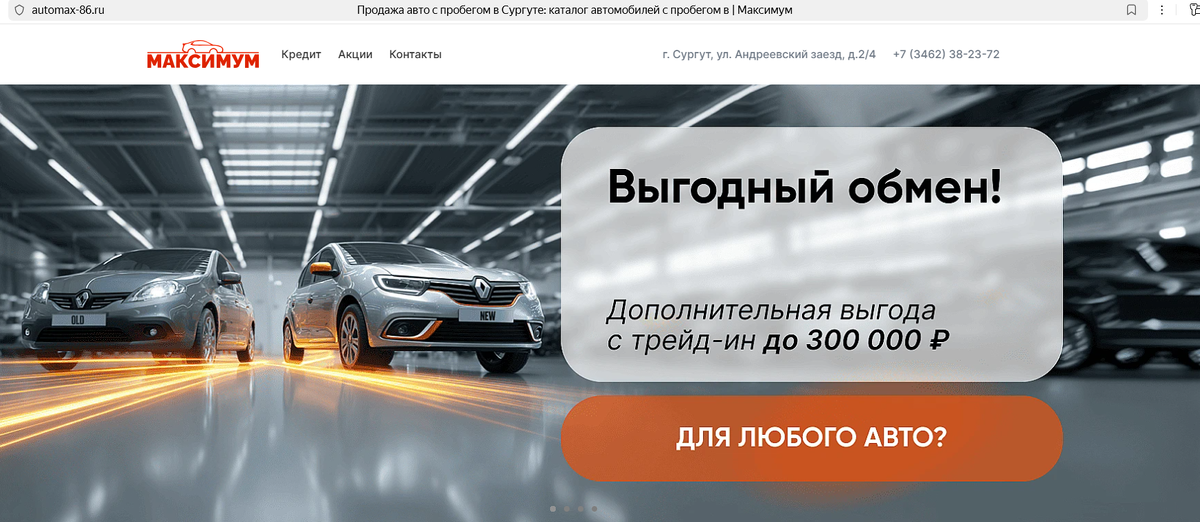 Максимум — это автосалон в Сургуте. Открылся недавно либо готовится к открытию. В информационном пространстве появился недавно. Предложения дилера выглядят подозрительно. Больше интересного — в нашем обзоре. В автосалоне на улице Андреевский заезд 2/4 в Сургуте можно купить как новый, так и подержанный автомобиль. Судя по всему, салон только готовится к открытию, так как его еще нет на картах. Наше внимание он привлек тем, что в его онлайн-каталоге представлены автомобили, снятые с производства в России в 2022 году. При этом дилер предлагает их по очень скромному ценнику, что весьма нелогично и подозрительно. На основании этого мы решили провести проверку. Владельцем автоцентра Максимум является ООО «АВТО МИР» (ИНН 8602317232). Компания была зарегистрирована в 2024 году с уставным капиталом 10 000 рублей. Среднесписочная численность сотрудников — 0 человек. Это является одним из косвенных признаков компании-однодневки. Владелец дилерского центра Максимум не фигурирует в делах о з