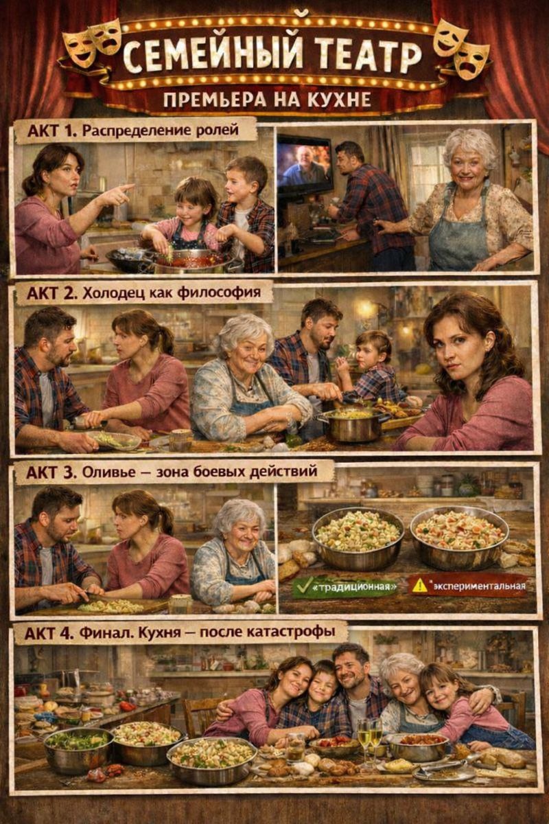 ДЕЙСТВИЕ 1: "РАСПРЕДЕЛЕНИЕ ОБЯЗАННОСТЕЙ" Мама: "Всем по заданию!" Папа: "Я режу лук" (уходит "проверить телик") Дети: "Мы украшаем!" (рассыпают блёстки) Бабушка: "Я всё сама сделаю" (уже делает) ДЕЙСТВИЕ 2: "ХОЛОДЕЦ — ЭТО ИСКУССТВО" 3 часа дебатов о том, сколько нужно бульона Папа тайком добавляет чеснок Мама обнаруживает и делает "этот взгляд" Все делают вид, что не заметили ДЕЙСТВИЕ 3: "ОЛИВЬЕ — ПОЛЕ БИТВЫ" "Морковку мельче!" "Горошек промыть?" "Майонез домашний или магазинный?" В итоге: 2 миски — "как всегда" и "экспериментальная" ДЕЙСТВИЕ 4: "ФИНАЛЬНЫЙ АККОРД" Кухня выглядит, как после урагана Все уставшие, но счастливые Запах праздника витает в воздухе И понимание: главное — не идеальный стол, а эти моменты вместе 👇 ОТМЕТЬТЕ РОДСТВЕННИКА, КТО УЗНАЛ СЕБЯ (особенно того, кто "проверяет телик" 😄)