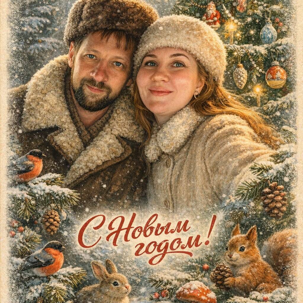 «Создай винтажную новогоднюю открытку на основе загруженной фотографии.