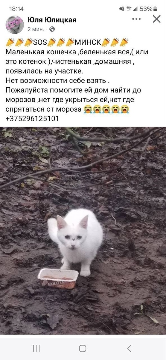 Спасите кошечку! Она замёрзнет насмерть! Кто-то выкинул домашнего котёнка! Ей негде укрыться от холода, через 2 дня будет мороз -15 градусов, она его не переживёт! Успейте спасти! +375296125101