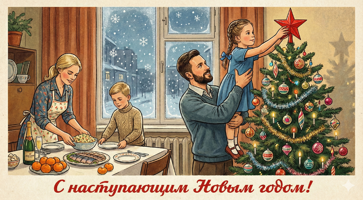 Иллюстрация в стиле винтажной советской новогодней открытки 70-х или 80-х годов. На картинке изображен мужчина с фото, он поднимает девочку с фото на руках, чтобы она надела на макушку елки красную звезду. Елка наряжена советскими стеклянными игрушками и красной звездой на верхушке. За окном падают крупные хлопья снега. Слева женщина с фото накрывает на стол, на столе посуда и блюда советской эпохи. Мальчик с фото ей помогает. Цвета мягкие, ностальгические, текстура бумаги слегка зернистая. Внизу красная каллиграфическая надпись на русском языке: "С наступающим Новым годом".