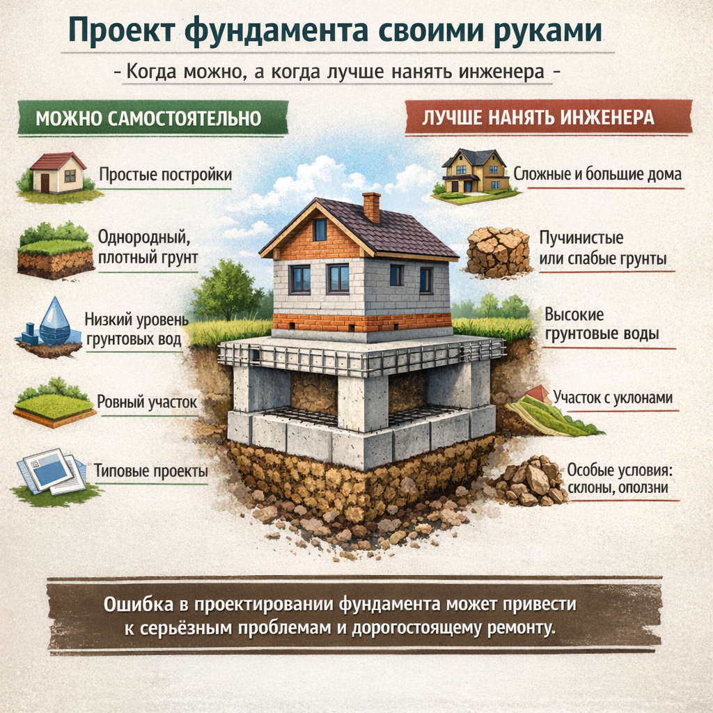 Поэтому вопрос “можно ли спроектировать самому” надо задавать не с точки зрения смелости, а с точки зрения риска: что будет, если Вы ошибётесь на 5–10%? Иногда сделать самому действительно можно. Но есть ситуации, где самостоятельный проект — это не экономия, а билет в историю с трещинами и просадкой. Самостоятельный подход бывает разумным, если совпали три условия: То есть: В таких случаях можно собрать решение аккуратно, не уходя в самодеятельность. Вот зоны, где экономия на проектировщике действительно опасна. Здесь фундамент выбирают не “по вкусу”, а по расчётной логике: площадь опоры, схема работы грунта, водоотвод, деформации. Кирпич, монолит, ж/б перекрытия, большая нагрузка — ошибки становятся дороже.