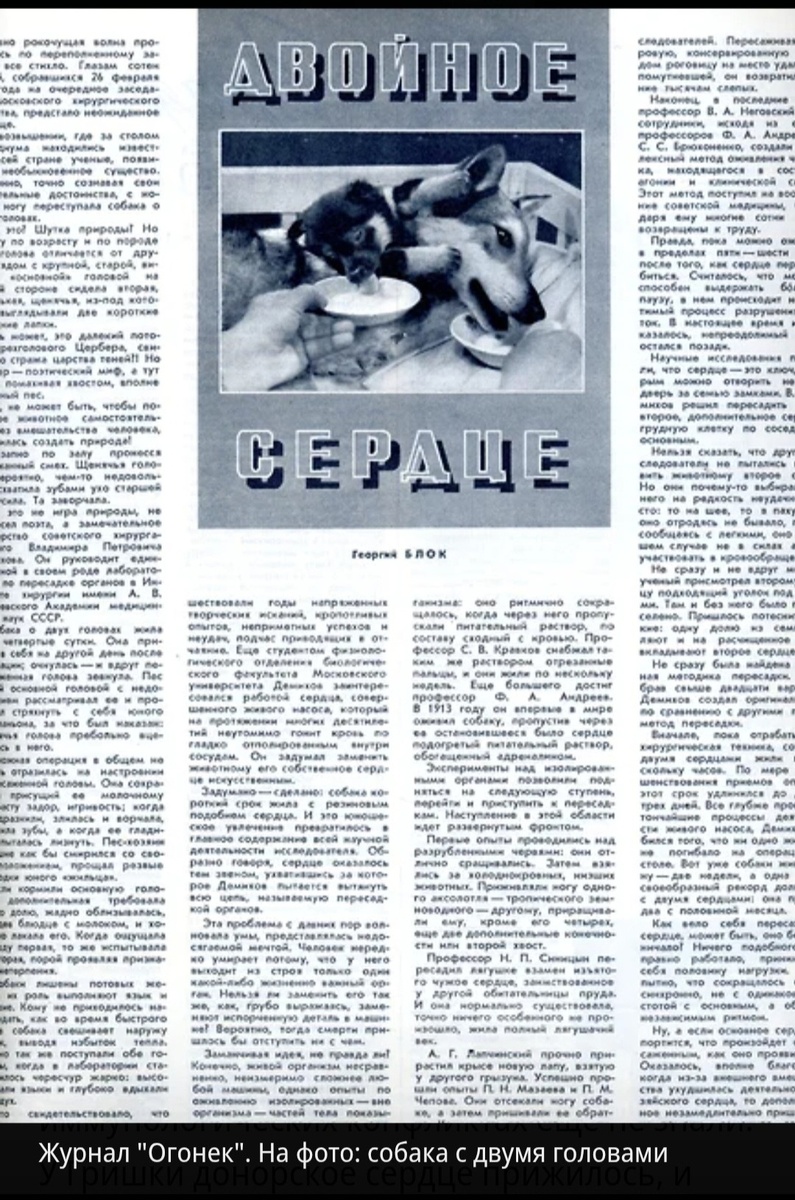 В 1937 году Владимир Демихов, студент третьего курса МГУ, сконструировал первое в мире искусственное сердце и вживил его собаке. Хвостатый пациент прожил всего два часа, но опыт отчасти был результативен, доказав, что искусственное сердце возможно.