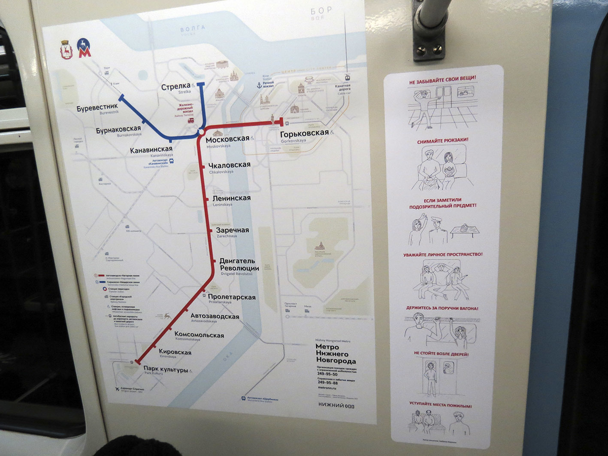 Нижегородский, по рождению Горьковский метрополитен в России третий - почти по всем параметрам: началу строительства (1977), запуску для пассажиров (20 ноября 1985 года), длине линий (без малого 22 километра) и числу станций (15). Иная картина складывается, если сравнивать в масштабах бывшего Союза: в сопредельных странах моложе только системы Днeпpoпeтрoвска и Алма-Аты, а меньше - этих же городов и Еревана. Схема в вагонах положена на план города, и реалистично лишена "перспективных участков", ибо выросло уже поколение, привыкшее, что участки эти остаются перспективными всю их жизнь. Как и в Новосибирске, где метрополитен по всем параметрам чуть-чуть уступает Нижегородскому, здесь полторы линии - полноценная Автозаводско-Нагорная (15 километров) и недоразвитая Сормовско-Мещерская (7 километров).