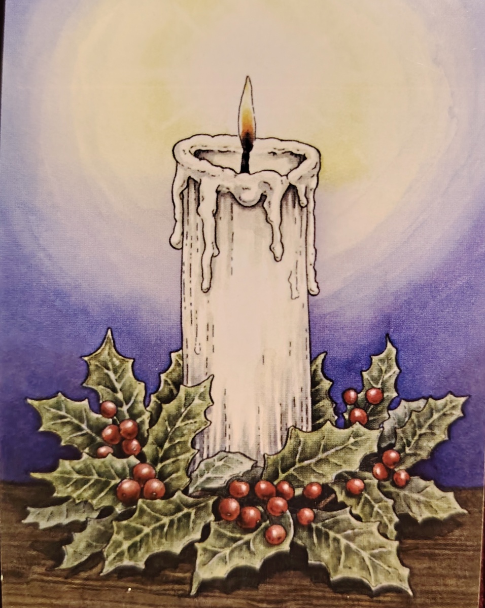 2. Каждый день в течение 12 дней выделяйте 10-15 минут. Зажгите свечу (белую, золотую, зелёную или красную — в духе Йоля). Возьмите колоду в руки, подышите, ощутите связь с этим особенным временем.