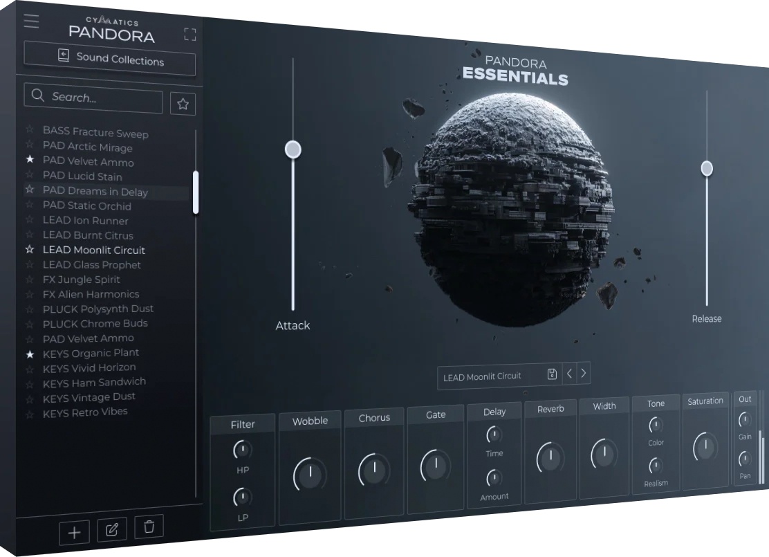Pandora — это инструмент для тех, кто не хочет тратить много времени на поиск тембров, но всё же ценит возможность подстроить звучание под идею трека. Он включает большую подборку готовых пресетов и позволяет легко менять их характер через встроенные эффекты. Здесь собраны звуки самых разных типов: мягкие падовые слои, винтажные клавиши, атмосферные синты, лиды, плотные басы.