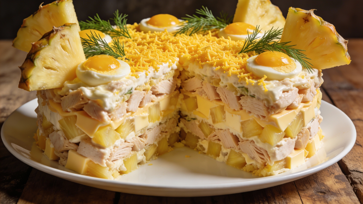 Классические салаты на Новый год вроде оливье и шубы все знают, но слоёный салат с курицей и ананасами воспринимается как что-то «по-особенному праздничное» и при этом делается из простых продуктов. Ананас отлично сочетается с курицей и сыром, создавая тот самый «ресторанный» вкус при минимуме усилий. Интересный факт: ананас был завезён в Россию в XIX веке и считался деликатесом, доступным только аристократам. Теперь же он стал символом праздничности и часто появляется именно на новогодних столах.