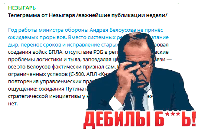 Есть занятный маркер по итогам коллегии Минобороны: даже часть привычно оппозиционных и либеральных каналов, которые обычно кормятся «катастрофами», в этот раз либо сбавили тон, либо вообще не стали разгонять тему. Потому что разгонять нечего — картинка получилась цельная, управленческая и неудобная для дешёвых страшилок. Но НЕЗЫГАРЬ, как всегда, выбрал путь “я не вижу реальность — я вижу методичку”. В своём посте про «ключевые события недели» он зачем-то снова вытаскивает старую заготовку про претензии к Белоусову. Причём не развивая тему, не добавляя нового смысла и не реагируя на контекст — просто повторяя один и тот же тезис. Это и есть главный признак канала влияния: когда линия не работает, нормальная редакция её меняет. А обслуживающая площадка — механически крутит дальше, потому что так настроен формат: не анализировать, а продавать интерпретацию. Теперь по сути. Давайте напомню, что коллегия реально зафиксировала: На этом фоне повтор НЕЗЫГАРЯ про “претензии к Белоусову” выгля