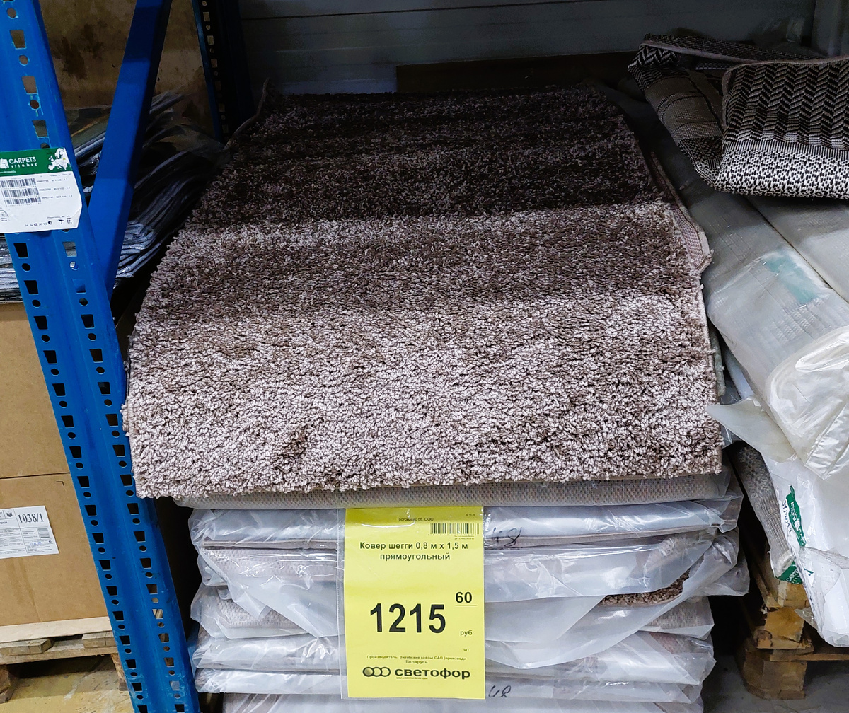 - Ковер "Шегги" 0,8*1,5 м за 1215,6 рублей - жене понравился. Хотя, если честно, он выглядит так, будто его вычесали из старой собаки. Но за такие деньги пусть будет! Тем более светлый оттенок практичнее, и пыль не так видно.