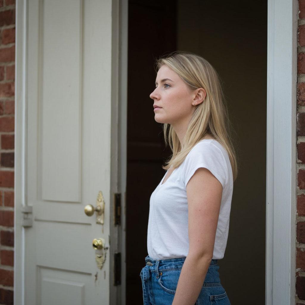 Без предупреждения она поднялась на этаж и, прежде чем нажать на звонок, решила поправить причёску. Она достала из сумки зеркальце, и в этот момент из‑за приоткрытой двери донеслись голоса. Один — Алексея, другой — женский, незнакомый.