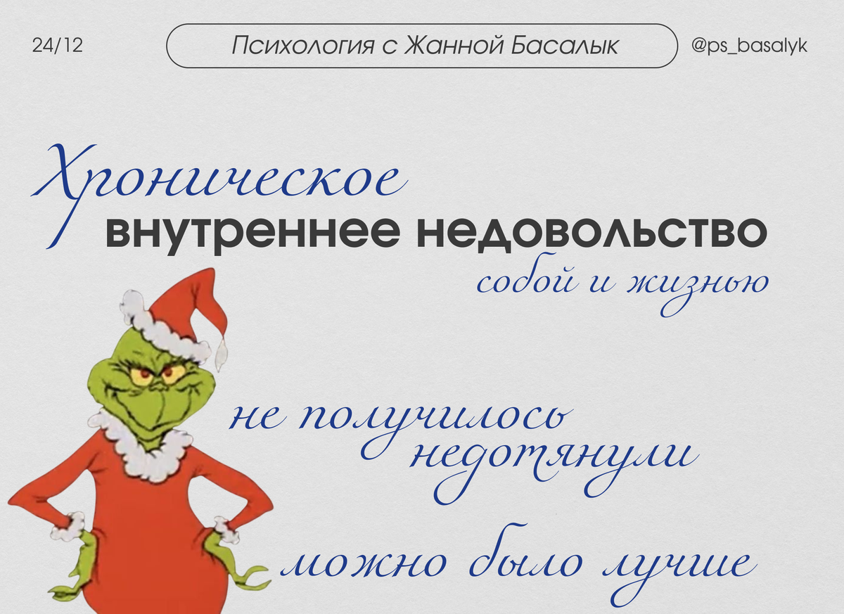 это не про завышенные ожидания, а про смещённый внутренний фокус. Вы замечаете: А то, что уже сделано, мозг автоматически обнуляет. Это называется обесценивание достижений — защитный механизм, а не реальная оценка. Даже если вы не садитесь подводить итоги, психика делает это сама. И если год был непростым, вместо «я справился» появляется: «мог(ла) бы больше» Когда ресурс на нуле, чувствовать радость просто нечем. Но вместо «я устал(а)» человек думает: «Со мной что-то не так» Это ошибка интерпретации, а не реальная проблема личности. У многих с детства закрепляется установка: В итоге удовлетворённость воспринимается как слабость. Частые признаки: Это не лень и не неблагодарность. Это перегруженная нервная система. В отличии от: восстановление контакта с