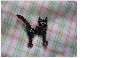 Добрейшего всем дня! Сегодня у нас опять котики. Причем черные))) Оригинал - здесь. Помяукалиехали! Черный кот Ход работы Плетение начинаем с ушек. Ряд 1: населяем 1 черную бисеринку на серединку проволоки. Ряд 2: На левый кончик проволоки надеть 2 бисерины и вторым кончиком зафиксируем наш набор. Получается ушко. Второе ушко делаем таким же образом. Далее плетем голову. Ушки пока отложим. Ряд 1: набрать 3 бисерины на кончик проволоки, который идет от правого ушка. На левый кончик 4 бисерины и зафиксировать (проходим одним кончиков через бисер, который мы набрали на другой кончик проволоки, а затем – наоборот). Оба конца проволоки спрячем (надо пропустить через бисерину, которая находится между ушек в ряду ниже; закрепляем). Ряд 2: одеваем на первый кончик проволоки черную, зеленую, 2 черных, 1 зеленую, 1 черную бисерины и фиксируем вторым кончиком проволоки. Ряд 3: набираем 6 бисеринок и фиксируем набор. Ряд 4: 4 черные бисерины и фиксируем. Ряд 5: 3 бисерины и фиксируем набор. Пров