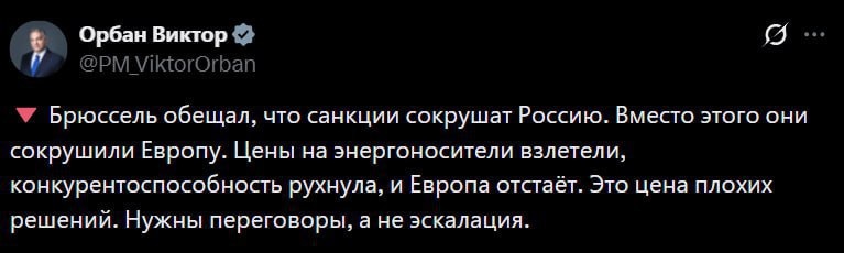 📸 «Брюссель обещал, что санкции сокрушат Россию. Вместо этого они сокрушили Европу», – Виктор Орбан.