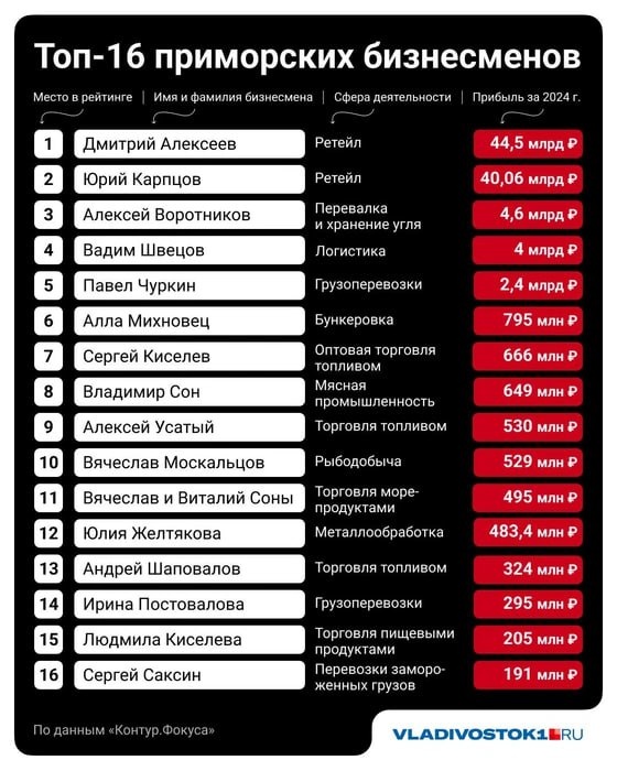В основном это рыбодобывающие и рыбообрабатывающие предприятия, но есть и вполне успешные ретейлеры, грузоперевозчики и даже металлургические компании. Редакция @vladivostok1 составила список владельцев приморских компаний с самым большим заработком за 2024 год. В него вошли: 🟥Дмитрий Алексеев 🟥Юрий Карпцов 🟥Алексей Воротников 🟥Вадим Швецов 🟥 Павел Чуркин и другие предприниматели, о которых вы точно слышали. Все, что известно о богатых людях из Приморья — в материале. 🟥 Подписаться | Предложить новость