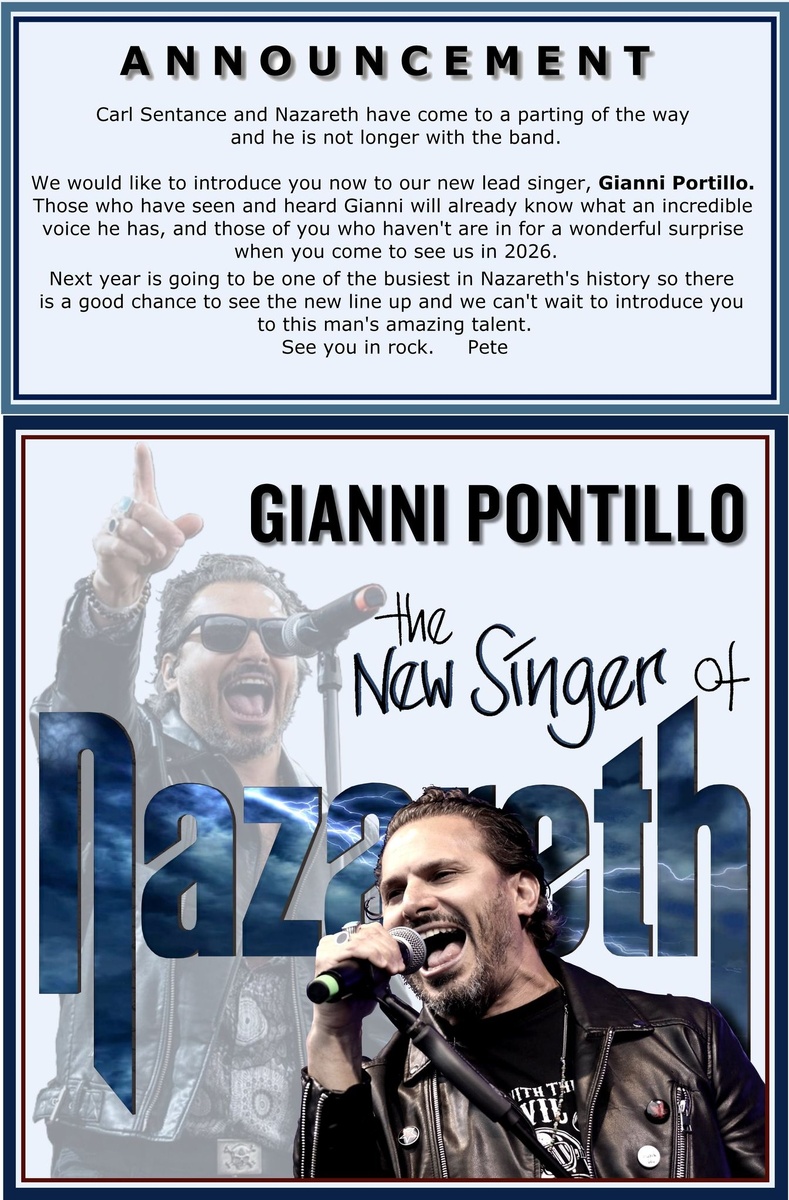 Пути Карла Сентанса и Nazareth разошлись – Карл больше не является участником группы. Мы хотим представить вам нашего нового вокалиста, Джанни Понтильо. Те, кто видел и слышал Джанни, уже знают, что он является обладателем невероятного голоса, а тех, кто еще не знаком с ним, ждет прекрасный сюрприз на наших концертах в 2026 году. Следующий год станет одним из самых насыщенных в истории Nazareth, так что у вас будет хороший шанс увидеть новый состав, и мы с нетерпением ждем возможности представить вам потрясающий талант этого парня.
