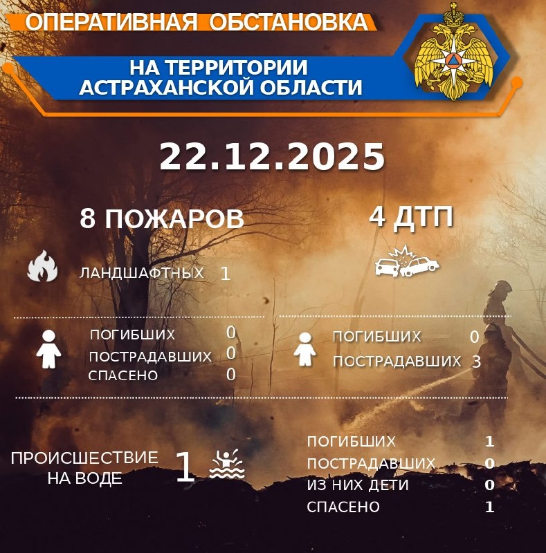 🚨Оперативная обстановка на территории Астраханской области по состоянию на 00:00 22.12.2025🚒