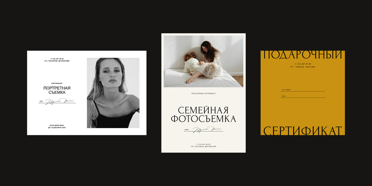 Друзья, в преддверии новогодних праздников наши дизайнеры подготовили для вас новые шаблоны подарочных сертификатов. Мы видим ваш интерес к нашим материалам и с радостью делимся свежими идеями ✨ Листайте галерею, чтобы увидеть примеры → Шаблоны сделаны для печати в размере А6, А5, А4, а так же в квадратном формате 1х1. Для каждого дизайна мы добавили превью в JPG, макет для редактирования в PSD и шрифты, которые необходимо установить на свой компьютер перед использованием шаблонов. Вы можете скачать и доработать сертификаты под себя: изменить цвет фона, вставить фотографии, добавить свой сайт и телефон. А после вручать клиентам или продавать как цифровой товар. Скорее выбирайте подходящий вариант и предлагайте своим клиентам выбрать отличный подарок для своих близких! Vigbo — первый сервис для фотографов на русскоязычном рынке, с 2011 года упрощаем работу мастеров и помогаем привлекать клиентов. Наша миссия — больше счастливых фотографов и красивых историй. Бесплатные галереи для перед