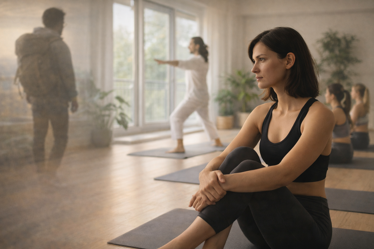 Алёна записалась в студию «Лотос». Первое занятие — десять человек на ковриках, спокойная музыка. Инструктор Даниил вошёл бесшумно: тридцать три года, худощавый, гибкий, с проницательным взглядом.