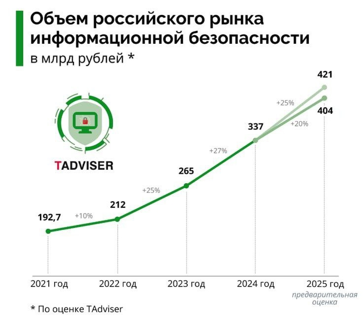 📈 По данным аналитического центра TAdviser, российский рынок кибербезопасности по итогам 2025 покажет рост в диапазоне 20-25%, а его объем превысит 400 млрд рублей. Цифровая трансформация и миграция компаний на отечественные платформы создают новую среду для защиты, где безопасность становится неотъемлемой частью бизнес-процессов. Малый и средний бизнес, который еще пять лет назад редко интересовался кибербезопасностью, теперь активно инвестирует в защиту ИТ-инфраструктуры. В крупных компаниях информационная безопасность перешла с операционного на стратегический уровень. Фокус смещается с защиты периметра на защиту данных на всех этапах жизненного цикла — бизнес осознал, что утечки влекут не только репутационные, но и прямые финансовые потери.