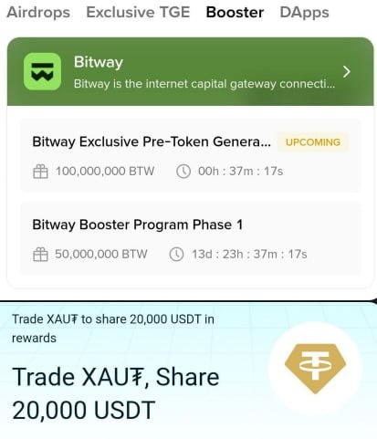 🤑Стартовал BOOSTER + 5 Alpha баллов и Bitget + XRP от Bybit 🟡Сейчас начался новый Booster $BTW нужно 165 поинтов -Подписки Twitter - Stake $20 USDT и все 🟡В 10-12.00 PRE-IDO $BTW нужно 216(-15) поинтов.По условиям ничего не изменили(обычный c 3 BNB) 〰️〰️〰️〰️ 🔵Доп 5 Alpha баллов Binance запустил промо где можно получить доп 5 баллов за переводы через чат. ✅ В главном меню жмем Больше - ищем "Chat" ✅ Пишем UID и жмем + ✅ Отправляем 5$+ (за каждые 2 транзы на РАЗНЫЕ UID получаем по 1 баллу,макс 5) Гайд от Binance👈 〰️〰️〰️〰️ 🪙10$ от Bitget Запустили новое промо где в рандоме 2000 чел смогут получить 10$.Ещё 3дня и шансы норм. ✅ Идем в Wallet,жмем баннер ✅ Меняем 10$ на XAUT(крипто золото) ✅ Холдим XAUT 3 дня 〰️〰️〰️〰️ ⬛️Также пришло около 4 XRP за стейк,кто делал чекните. 💎Квартире через Крипту | Все для Абуза