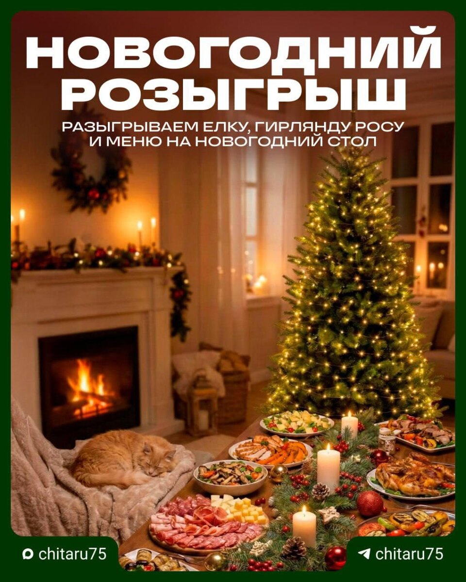 ru. Один подписчик получит готовый новогодний стол с блюдами грузинской кухни из ресторана, а второй — премиальную искусственную елку высотой в 1,8 метра вместе с трендовой гирляндой-росой. Меню: 👉Рулетики из баклажан; 👉Ассорти из мясных закусок; 👉Тёплый салат с телятиной и вешенками; 👉Салат с сыром гуда; 👉С индейкой и печеной тыквой; 👉Горячее: мясное изобилие; 👉Цыпленок тапака; 👉Овощи на мангале; 👉Хачапури по-мегрельски большая. Условия максимально простые — нужно подписаться на два канала «Чита.Ру» в MAX. ➡️ Основной новостной канал «Чита.Ру». ➡️ Канал «Истории». ✨Обязательно переслать пост другу. После выполнения всех условий нужно нажать кнопку «Участвую» под конкурсным постом и поставить лайк. Рандомайзер подведет итоги уже через 3 дня — 25 декабря. Все условия проверим вручную, а в случае несоблюдения победителя переизберем.