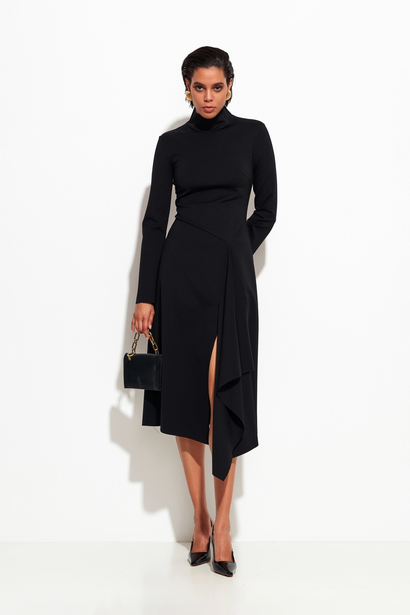 Платье Lakbi из коллекции осень-зима 2025/26 — лаконичная и выразительная модель длины миди с высокой горловиной.