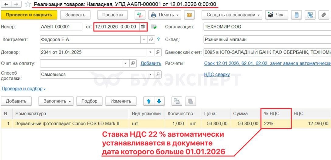Когда вы пробиваете чек - 1С Бухгалтерия 8.3 передает на онлайн-ККТ набор фискальных данных со ставкой НДС НДС 22%. Важно, чтобы эти ставки были прошиты в онлайн-ККТ. ❗️Самостоятельно установить новую ставку НДС 22% в онлайн-ККТ нельзя. Необходимо обратиться в обслуживающую онлайн-ККТ сервисную организацию за последней версией прошивки. ✅ После обновления прошивки онлайн-ККТ вы сможете пробивать чеки со ставкой НДС 22% с 01.01.2026. ▫️Перейдите в документ Реализация (акт, накладная, УПД) и нажмите кнопку «Чек». В окне предпросмотра чека убедитесь, что ставка НДС указана верно. Затем нажмите «Печать чека». 📌 Подробнее о работе с онлайн-ККТ в 2026 году расскажем на эфире Бухэксперт 25 декабря, регистрируйтесь на эфир 👉 здесь