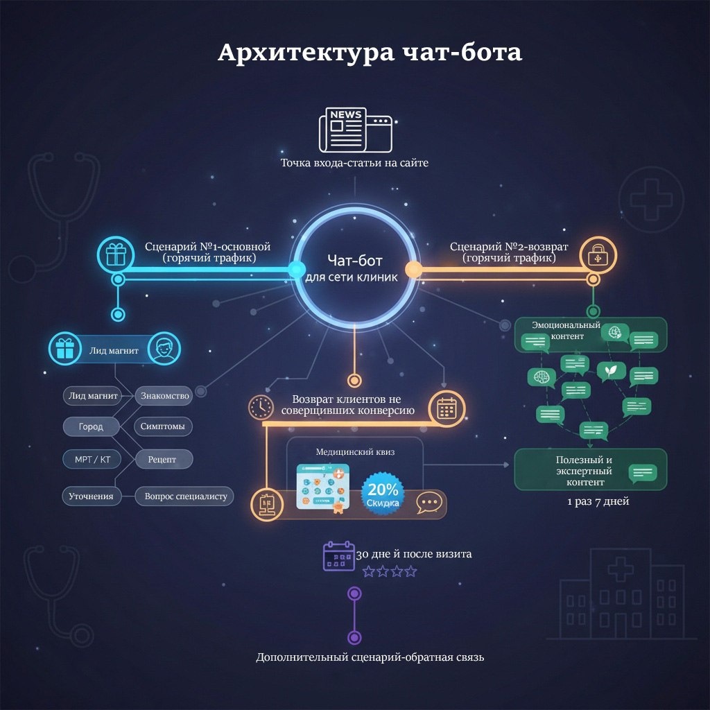 ΠΠ΅ΠΉΡ: ΡΠ°Ρ-Π±ΠΎΡ Π΄Π»Ρ ΡΠ΅ΡΠΈ ΠΊΠ»ΠΈΠ½ΠΈΠΊ ΠΠ·Π³Π»ΡΠ΄ Π΄ΠΈΡΠ΅ΠΊΡΠΎΡΠ° ΠΏΠΎ ΠΌΠ°ΡΠΊΠ΅ΡΠΈΠ½Π³Ρ Ρ 5-Π»Π΅ΡΠ½ΠΈΠΌ ΠΎΠΏΡΡΠΎΠΌ ΠΠ°Π΄Π°ΡΠ° Π±ΡΠ»Π° ΠΏΡΠΎΡΡΠΎΠΉ ΠΏΠΎ ΡΠΎΡΠΌΡΠ»ΠΈΡΠΎΠ²ΠΊΠ΅, Π½ΠΎ ΡΠ»ΠΎΠΆΠ½ΠΎΠΉ ΠΏΠΎ ΡΠ΅Π°Π»ΠΈΠ·Π°ΡΠΈΠΈ: ΠΏΡΠ΅Π²ΡΠ°ΡΠΈΡΡ ΡΡΠ°ΡΠΈΠΊ ΡΠΎ ΡΡΠ°ΡΠ΅ΠΉ Π² Π·Π°ΡΠ²ΠΊΠΈ, Π½Π΅ ΠΏΠ΅ΡΠ΅Π³ΡΡΠΆΠ°Ρ ΠΏΠΎΠ»ΡΠ·ΠΎΠ²Π°ΡΠ΅Π»Ρ ΠΈ Π½Π΅ ΠΏΡΠ΅Π²ΡΠ°ΡΠ°Ρ ΠΊΠΎΠΌΠΌΡΠ½ΠΈΠΊΠ°ΡΠΈΡ Π² Π°Π³ΡΠ΅ΡΡΠΈΠ²Π½ΡΠ΅ ΠΏΡΠΎΠ΄Π°ΠΆΠΈ. Π Π΅ΡΠ΅Π½ΠΈΠ΅ΠΌ ΡΡΠ°Π» ΠΌΠ½ΠΎΠ³ΠΎΡΡΠΎΠ²Π½Π΅Π²ΡΠΉ ΡΠ°Ρ-Π±ΠΎΡ Ρ Π»ΠΎΠ³ΠΈΠΊΠΎΠΉ Π²ΠΎΡΠΎΠ½ΠΊΠΈ ΠΈ ΡΠ΅Π³ΠΌΠ΅Π½ΡΠ°ΡΠΈΠ΅ΠΉ. π ΠΡΡ