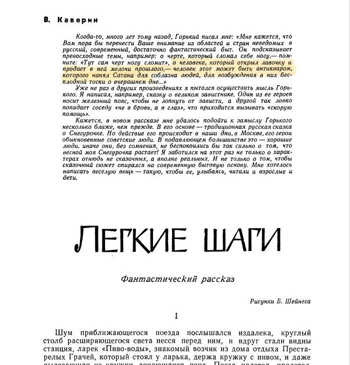 Недавно я рассказывал, что первую публикацию своей сказки «Легкие шаги» в журнале «Москва» Вениамин Каверин начал словами: «Когда-то, много лет тому назад, Горький писал мне: "Мне кажется, что Вам пора бы перенести Ваше внимание из областей и стран неведомых в русский, современный, достаточно фантастический быт. Он подсказывает превосходные темы, например: о черте, который сломал себе ногу,— помните: "Тут сам черт ногу сломит", о человеке, который открыл лавочку и продает в ней мелочи прошлого,— человек этот может быть антикваром, которого нанял Сатана для соблазна людей, для возбуждения в них бесплодной тоски о вчерашнем дне..."». Совету усатого классика автор «Двух капитанов», как известно, не последовал, и ничего подобного не написал. Зато, как напомнил Кирилл Зубков, — Стивен Кинг не побрезговал использовать сюжет, подсказанный пролетарским писателем. Имеется в виду, конечно же, роман Needful Things, выходивший в русских переводах под названиями «Нужные вещи», «Самое необходимое» и