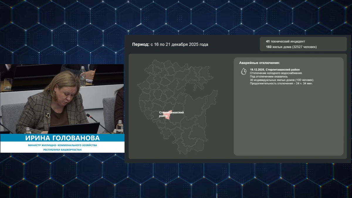 На оперативном совещании в правительстве министр ЖКХ республики Ирина Голованова сообщила, что за прошедшую неделю в регионе произошел один случай отключения подачи коммунальных ресурсов с превышением с допустимой продолжительности перерыва их предоставления. Аварийное отключение холодного водоснабжения произошло 19 декабря в одном из сел Стерлитамакского района, где во время земляных работ был поврежден центральный магистральный трубопровод. Без воды на сутки с лишним остались 30 частных домов, в которых проживают сто человек. Кроме того, за минувшую неделю в республике был зафиксирован 41 технический инцидент. Под отключением ресурсов оказались 183 жилых дома (более 32 тысяч жильцов). Все неполадки были устранены в пределах нормовремени. «По всем перечисленным отключениям проведены ремонтные работы. Подача коммунальных ресурсов полностью возобновлена», – доложила министр. Скриншот видеотрансляции оперативного совещания правительства РБ.