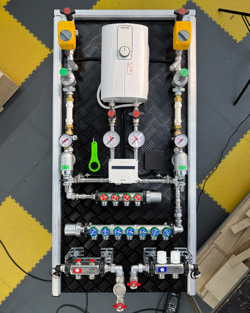 Если у собственника уже есть установленные и опломбированные приборы учёта, нет смысла покупать новые. Поэтому узел изначально собирается строго под габариты будущих счётчиков, с точностью до миллиметра, после чего полностью опрессовывается и готовится к установке. На объекте заглушки снимаются, счётчики ставятся на штатные места — и система работает так, будто они были здесь всегда. Никаких переделок, перекосов, «дотягиваний» и лишних фитингов. Это аккуратная инженерия, рассчитанная заранее, а не «допиливание» на объекте. При габаритах 120 × 79 см в этом узле разместилось н